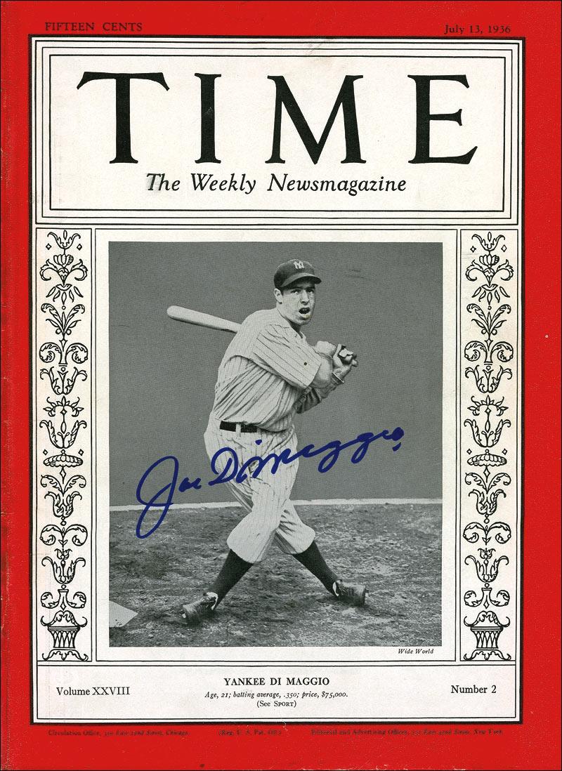 Time magazine, dated July 13, 1936, featuring DiMaggio on the cover, signed on the front cover in blue felt tip. In fine condition, with some expected light handling wear. Well preserved condition for its age with no mailing label present on front to detract from the overall aesthetic of the piece. Pre-certified Steve Grad/PSA/DNA and RRAuction COA.