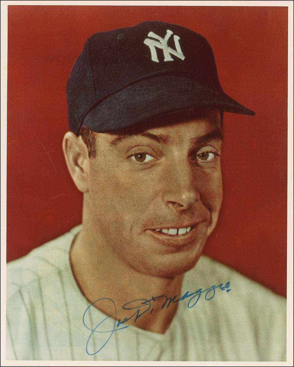Color satin-finish 8 x 10 head-and-shoulders photo of DiMaggio in his Yankees jersey and cap, signed in blue felt tip. In fine condition, with scattered light spotting to finish. Pre-certified Steve Grad/PSA/DNA and RRAuction COA.