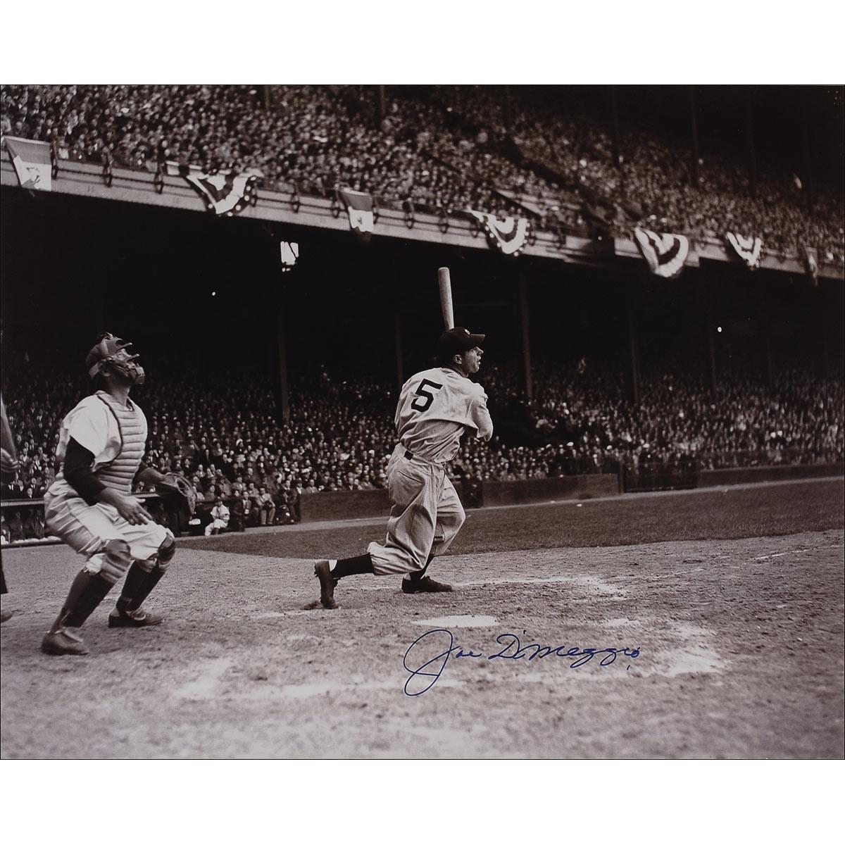 Satin-finish 20 x 16 sepia-toned photo of DiMaggio just finishing a huge swing, boldly signed in blue felt tip. A few trivial dings to extreme top edge, otherwise fine condition.
