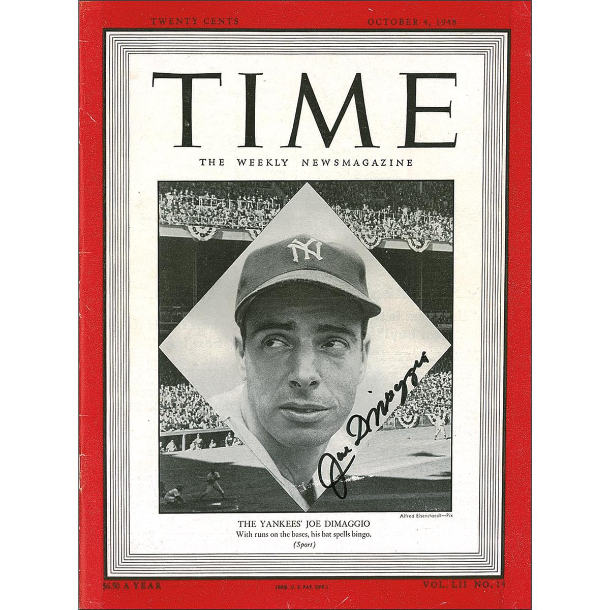 Time magazine from October 4, 1948, featuring DiMaggio on the cover, signed on the front cover in black felt tip. In fine condition, with expected handling wear and some light toning. Accompanied by a certificate of authenticity from Score Board.