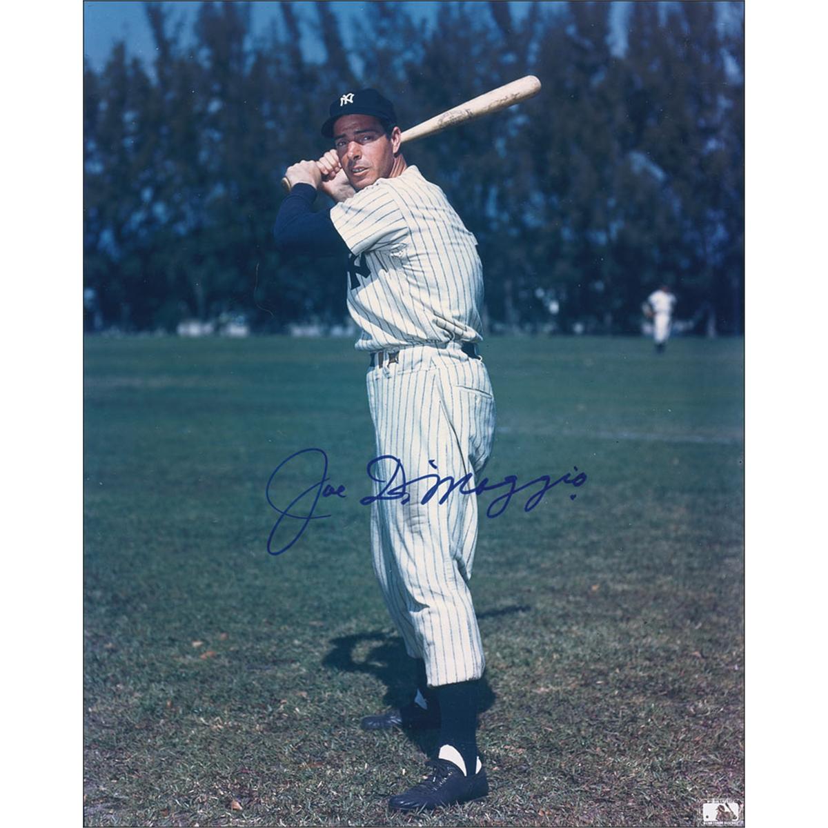 Color glossy 8 x 10 photo of the Yankee Clipper likely during spring training, signed in blue felt tip. In very fine condition.