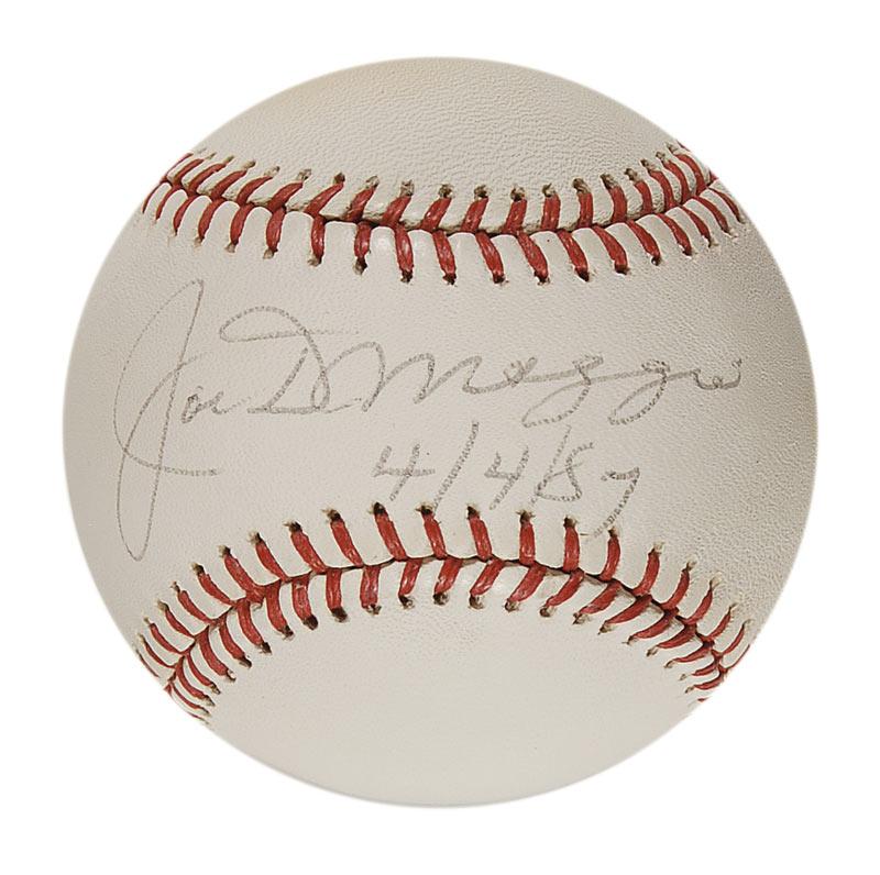 Official Rawlings American League baseball signed in black ballpoint on the sweet spot, “Joe DiMaggio 4/4/87.” In fine condition, with a few areas of toning and staining and the signature a bit light.