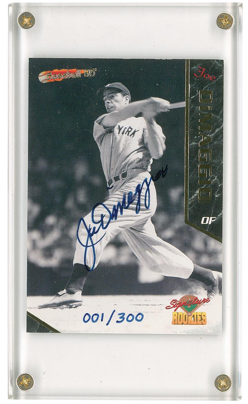 Limited edition Signature Rookies baseball card, 2.5 x 3.5, #001/300, signed on the front in blue felt tip by DiMaggio. In fine condition. Accompanied by a Certificate of Authenticity from DiMaggio’s long time friend and attorney Morris Engelberg.