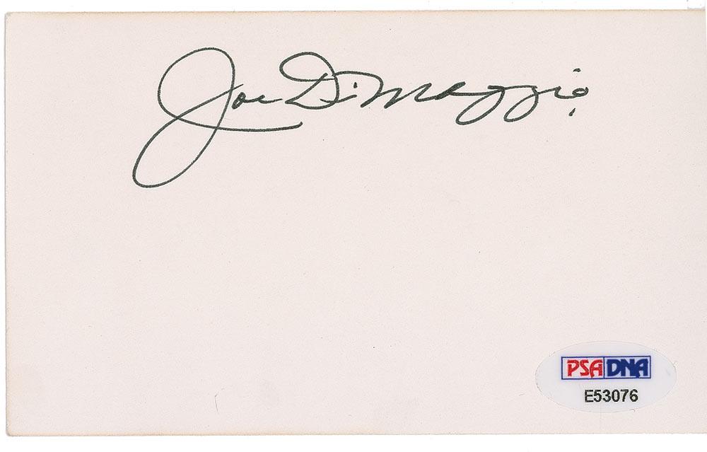 Black felt tip signature, “Joe DiMaggio,” on a white 5 x 3 card. In fine condition, with a PSA/DNA authentication label affixed to the card.