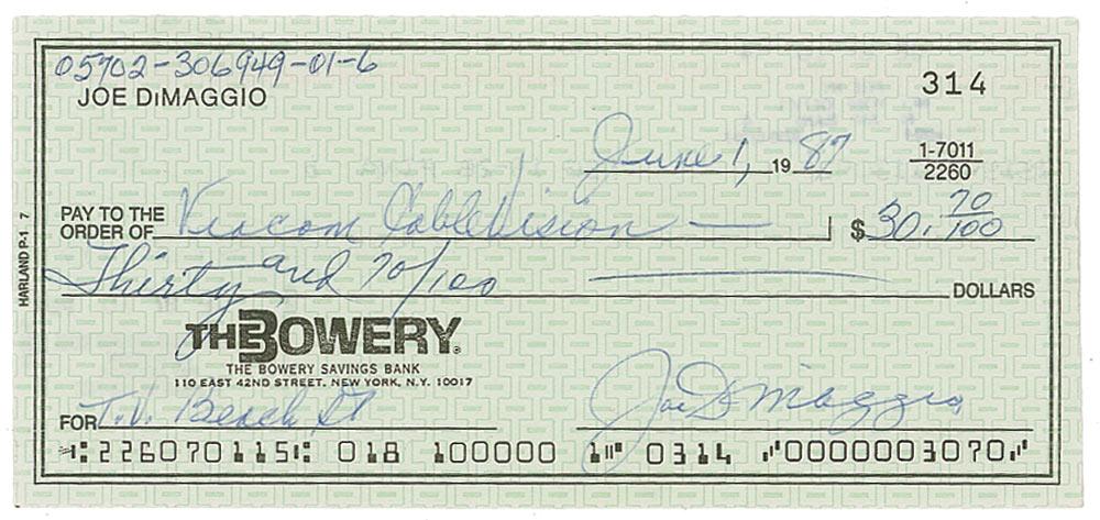 Personal check, 6 x 2.75, filled out and signed by DiMaggio, payable to Viacom CableVision for $30.70, June 1, 1987. In the memo line DiMaggio has written “T.V. Beach St.” In fine condition.