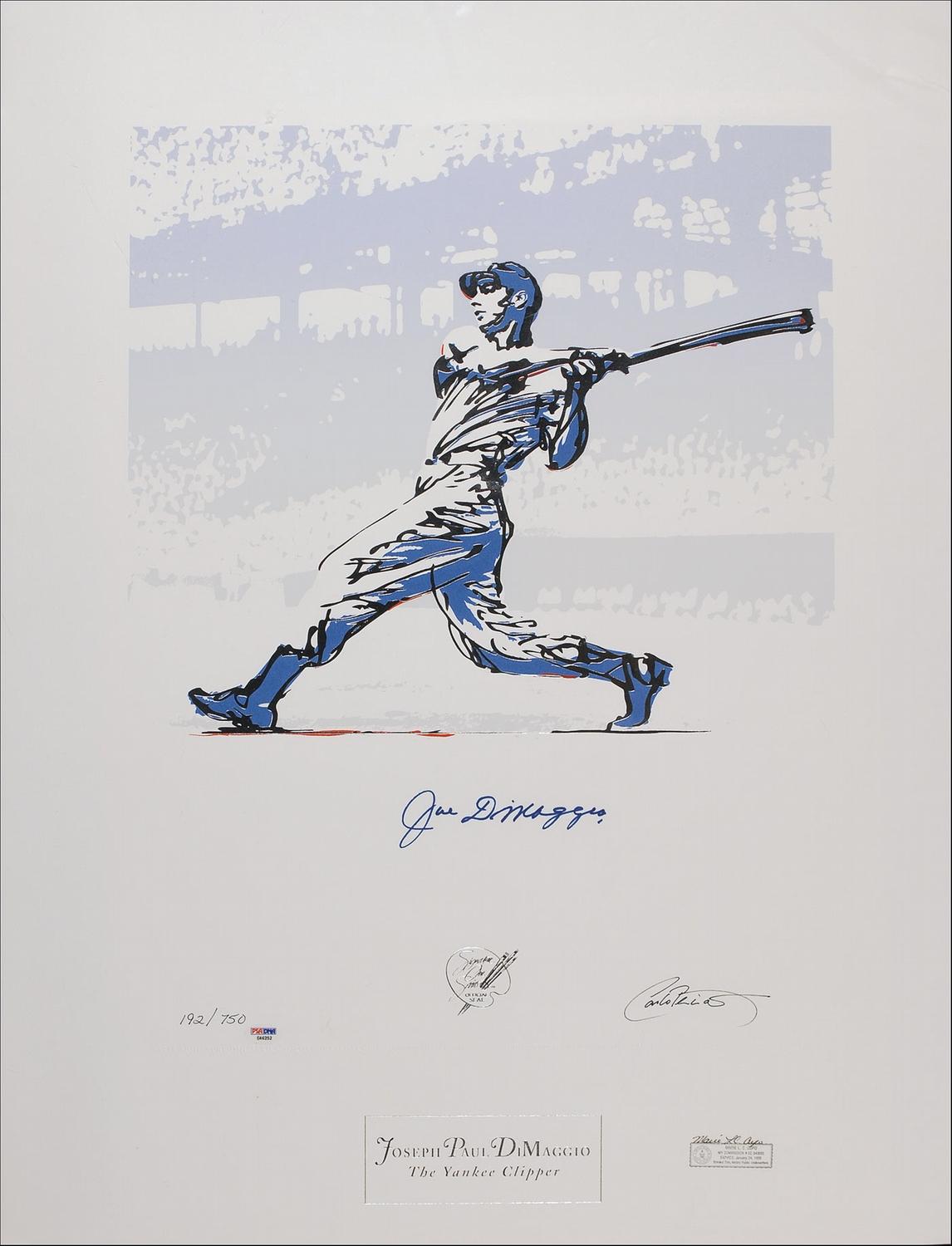 Color limited edition 25 x 32 lithograph entitled ‘Joseph Paul DiMaggio, The Yankee Clipper,’ numbered #192/750, signed in blue felt tip by DiMaggio. Also signed in felt tip by the artist, Carlo Beninati, as well as Notary Public Marie Cupo. Some creases to edges and top right corner, which could be matted out, and some light horizontal creases, otherwise fine condition. Rolled. Accompanied by a full letter of authenticity from PSA/DNA, as well as a notarized certificate of authenticity bearing a photo of DiMaggio taken at time of private signing.