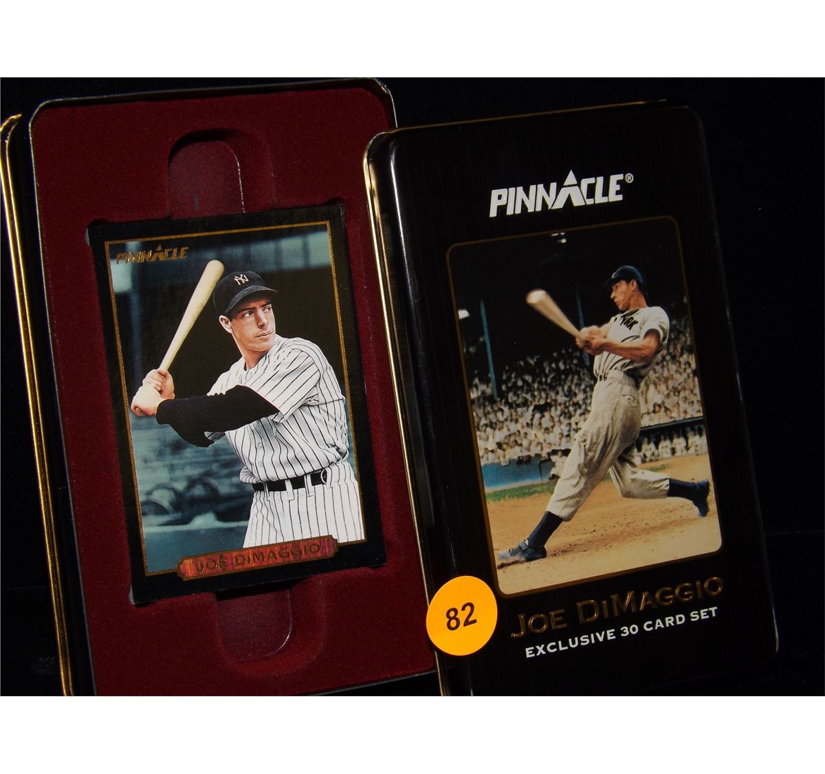 Joe Dimaggio Trading Card Set. 1993 Pinnacle Trading Card Set (30 cards) in Metal Tin and Original Box. Appraised or estimated retail value $250. No COA. All Sales Final. Please see terms and conditions of auction.