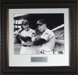 Joe DiMaggio and Mickey Mantle custom Deluxe Leather framed and matted unautographed 11X14 photo. Joe Dimaggio played his entire 13-year baseball career for the New York Yankees. He was voted into the Baseball Hall of Fame in 1955. Mantle played his storied 18-year major-league professional career all for the New York Yankees, winning 3 American League MVP titles and playing in 16 All-Star games.