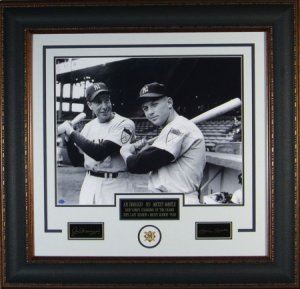 Joe Dimaggio played his entire 13-year baseball career for the New York Yankees. He was voted into the Baseball Hall of Fame in 1955. Mantle played his storied 18-year major-league professional career all for the New York Yankees, winning 3 American League MVP titles and playing in 16 All-Star games. This is a Joe DiMaggio and Mickey Mantle custom premium framed unautographed Signature Engraved oversize 33x32 piece. FEATURING THE ENGRAVED REPLICA SIGNATURES OF Hall of famers Joe DiMaggio and Mickey Mantle.