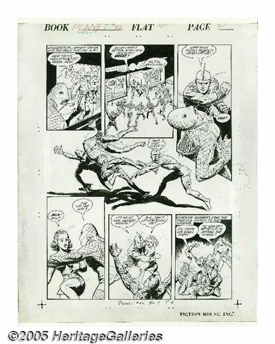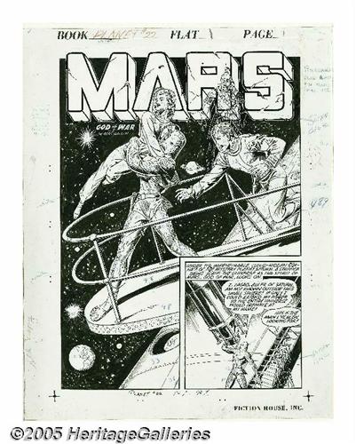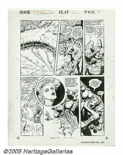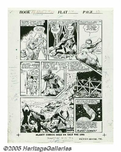 <B>Joe Doolin - Planet Comics #22 Complete 10-page Mars God of War Story Original Art (Fiction House, 1943).</B></I> When Zargo, the ruler of Saturn, is possessed by Mars, the God of War, war breaks out as the Saturnians attack a super space-liner from Earth. Only the heroics of Captain Bill Taylor (and his lovely passenger Flo) can thwart the vicious attack. Joe Doolin's detailed art, showcasing fantastic aliens and rocket ships galore, is absolutely superb. Doolin succeeded Dan Zolnerowich as the main cover artist on <B>Planet Comics</B></I>, and he was responsible for some of the most memorable space "good girl" covers of the Golden Age. The image area of each page measures 13" x 18", and the art is in Excellent condition.