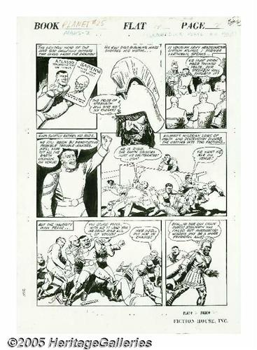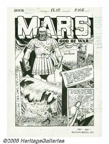 <B>Joe Doolin - Planet Comics #25 Mars God of War Splash Page 1, and page 2 Original Art (Fiction House, 1943).</B></I> Mars, the God of War, unleashes a terrible tsunami of death on this powerhouse splash for "The Harp of Hate." Joe Doolin's crisply inked splash page projects the apocalyptic anger of Mars' attack. Page two starts the yarn off with a bang as Mars enters the body of Atlasso, a former Earthman, and tries to stir up a war with Venus -- and comparisons with Adolph Hitler are made! Joe Doolin was Fiction House's main cover artist, and since he was in his late forties when World War II broke out, he was one of the few Fiction House artists who did not go off to that war. The image area of each page measures 13" x 18". The title logo stat on the splash is a carefully color-matched replacement; otherwise the art is in Excellent condition.