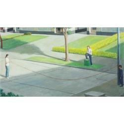 Joe Dunne (b.1957) EVENING STREET GAME signed in monogram lower right; inscribed with title and date [2001] and signed again on reverse casein and egg/oil tempera on board 33 by 57cm., 13 by 22.5in. Provenance: Jorgensen Fine Art, Dublin; Private collection, Dublin Born in Dublin, Joe Dunne studied at NCAD 1975-1978. He held his first solo exhibition in 1980 in Freiberg, Germany, and has subsequently exhibited throughout Europe. Since 1982 he has shown at the RHA annual exhibitions, where he was awarded the Self Portrait Medal in 1986 and won the highly acclaimed Don Niccolo Caracciola Award in 1993 and 2001. Commissions include portraits of former Taoiseach Eamon DeVelera and President Mary McAleese, as well as four stamp issues for An Post.