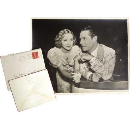 <B>Joe E. Brown Autographed Studio Portrait with Marian Marsh.</B></I> An 11" x 14" studio portrait of Joe E. Brown and Marian Marsh from the set of their 1937 film, <I>When's Your Birthday?,</B></I> signed by Brown and inscribed: "Gee Marian! It was fun being your leading man, Joe Brown 1/20/36." Also included is a Christmas card from Joe E. Brown and family from 1937. In Very Fine condition with age-toning, corner wear and tack holes to photograph, and mild toning to card. <I>From the Marian Marsh Archive</B></I>. <I>Accompanied by LOA from PSA/DNA.</B></I><BR><BR><b>Shipping:</b> Flat Material, Small (<a target="_blank" href="http://www.heritageauctions.com/common/shipping.php">view shipping information</a>)