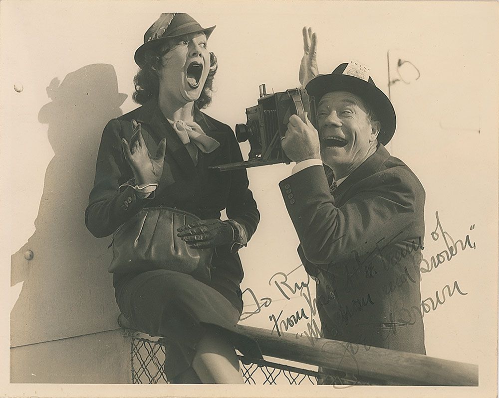 Humorous vintage matte-finish 10 x 8 photo of Brown taking a photo of Ethel Merman, signed and inscribed in fountain pen, “To Rutgers, From half of the team of ‘Merman and Brown,’ Joe E. Brown.” In fine condition, with some slight rippling to edges and moderate contrast to signature against Brown’s dark suit.