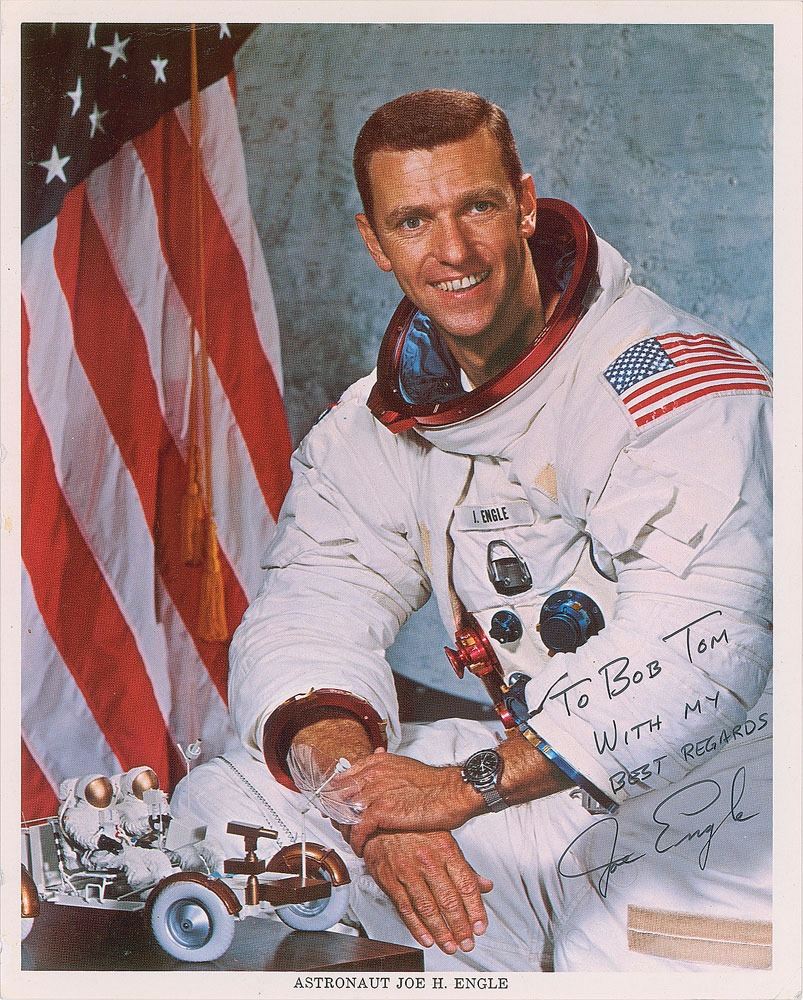 Official color 8 x 10 NASA lithograph of Engle posing in his white space suit, signed and inscribed in black felt tip, "To Bob Tom, with my best regards, Joe Engle.” In fine condition, with a few minor edge dings. Signed photos of Engle wearing the white Apollo space suit remain quite scarce and sought-after. Engle was initially named as the prime LMP for the Apollo 17 mission before being replaced by geologist Harrison Schmitt for the position; the scientific community pressured NASA to assign an experienced scientist to explore the Moon, and not simply a test pilot with limited geology training. Engle went on to fly on the Space Shuttle Approach and Landing Test Flights, as well as Space Shuttle missions STS-2 and STS-51-I.