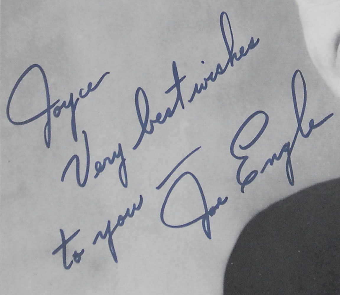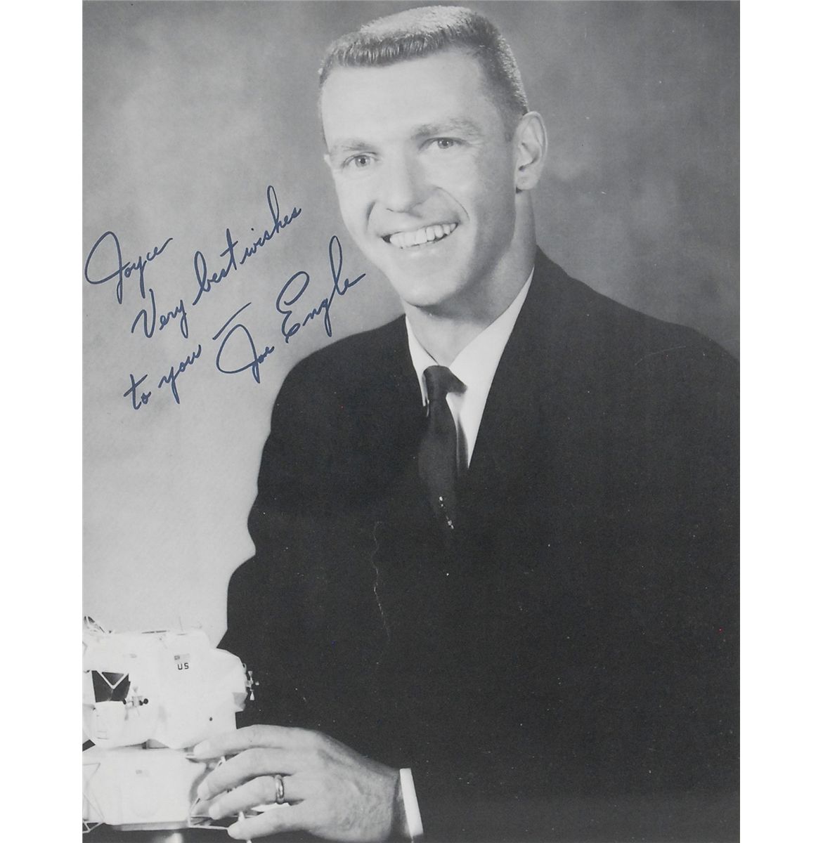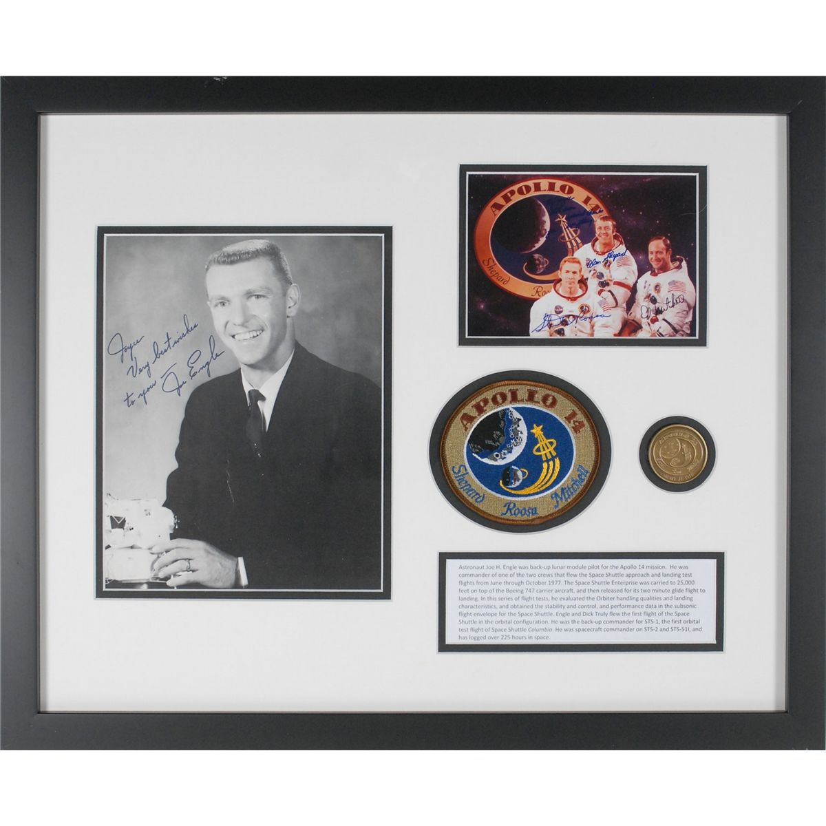 Official NASA 8 x 10 lithograph of Engle posing with a LEM model, signed and inscribed in black felt tip, “Joyce, Very best wishes to you—Joe Engle.” Double-matted and framed with an Apollo 14 patch, medallion, a color photo of the prime crew of Apollo 14 bearing printed signatures, and a printed biography to an overall size of 21.5 x 17.5. In fine condition, with a mild vertical crease near bottom. Inscribed to longtime NASA employee Joyce Abrams, who was a senior member of the ground support team.