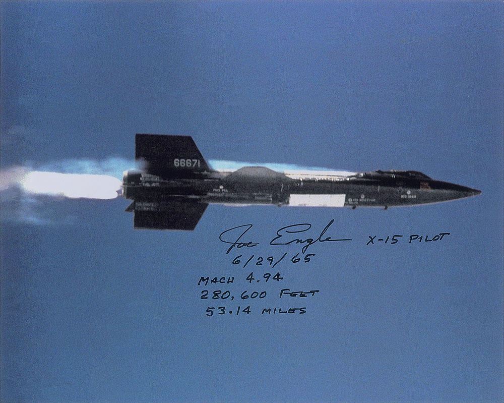Color satin-finish 10 x 8 photo of the X–15 rocket plane flown by Engle during his historic flight on June 29, 1965, signed in black felt tip, "Joe Engle X–15 Pilot, 6/29/65, Mach 4.94, 280,600 Feet, 53.14 Miles." In very fine condition.