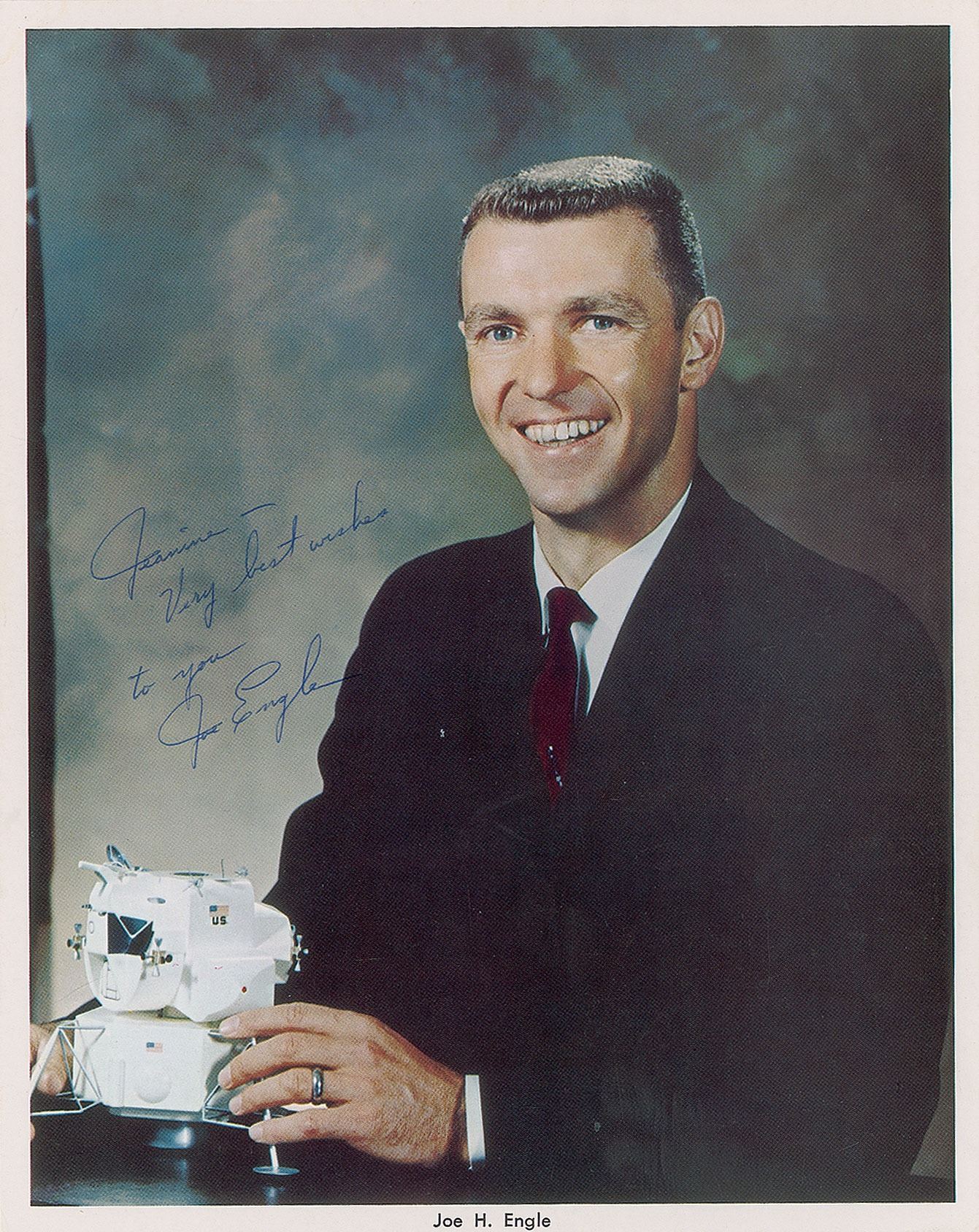 Official color 8 x 10 NASA lithograph of Engle posing with a model of the lunar module, signed and inscribed in blue ballpoint, "Jeanine, very best wishes to you, Joe Engle.” In very fine condition. Recipient was an employee at the Los Angeles International Airport who assisted astronauts with picking up their GSA vehicles circa 1967.