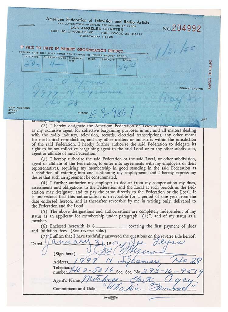 Actor best-known as Capt. Binghampton on McHale’s Navy. DS, one page both sides, 6.5 x 9, American Federation of Television and Radio Artists letterhead, May 20, 1957. Application for membership to AFTRA, filled out in another hand and signed on the front in blue ballpoint. In fine condition, with AFTRA receipt stapled to the front. Pre-certified PSA/DNA and RRAuction COA.