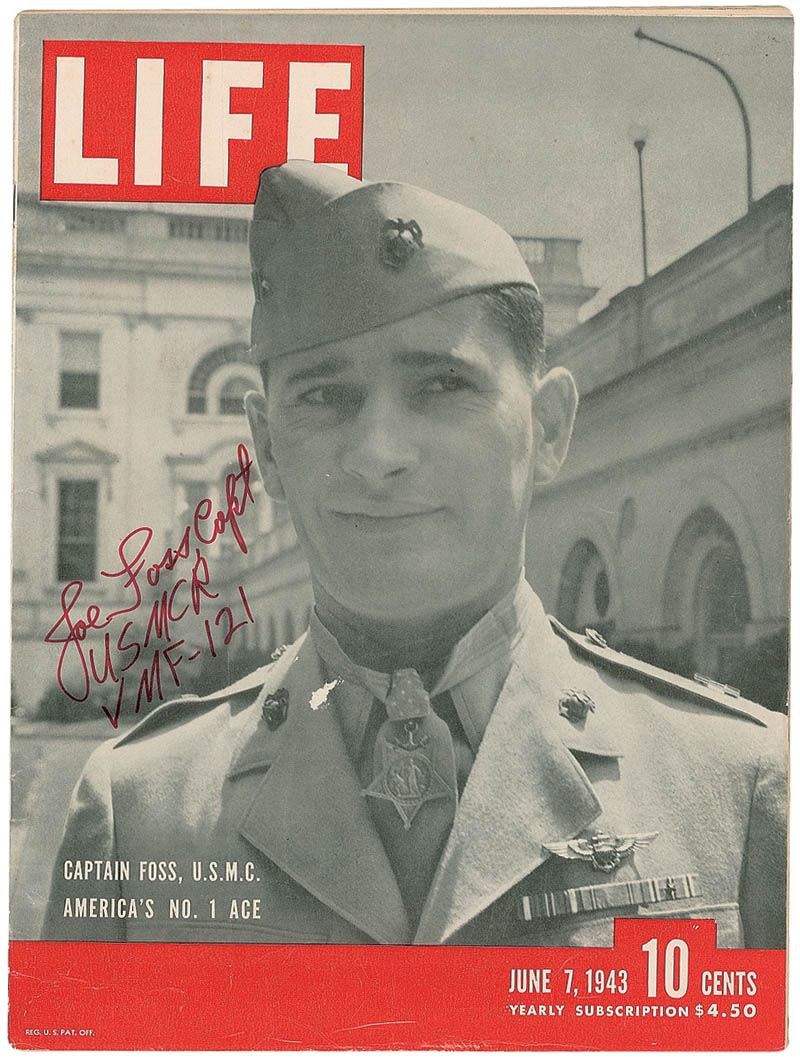 Life magazine, dated June 7, 1943, featuring Foss on the cover, signed on the cover in red felt tip, “Joe Foss, Capt., USMCR VMF-121.” In fine condition, with scattered light cover creases and some mild foxing.