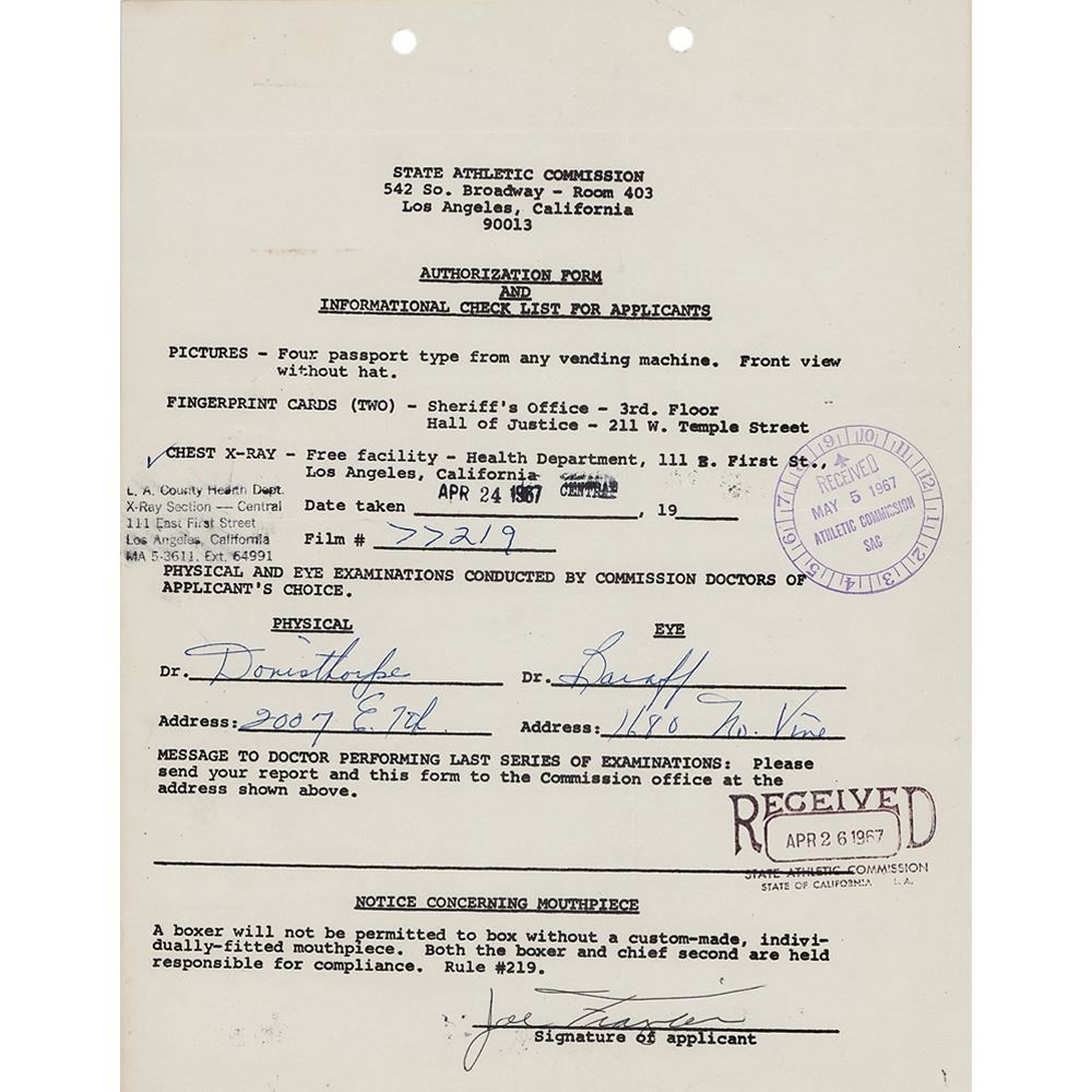 DS, one page, 8.5 x 11, April 24, 1967. A State Athletic Commission authorization form and informational checklist for applicants, listing the various requirements and examinations needed for a sanctioned boxing match, such as four passport photos, two fingerprint cards, a chest x-ray, and physical and eye examinations. The form is signed and approved by two physicians and is signed at the conclusion in black ballpoint by Joe Frazier. In fine condition. An Athletic Commission receipt stamp dates to May 5, 1967, the day after Frazier improved to 16-0 with a unanimous decision win over George Johnson. He would go undefeated over the next five-and-a-half years, including a win over Muhammad Ali on March 8, 1971, before losing to George Foreman via TKO on January 22, 1973.