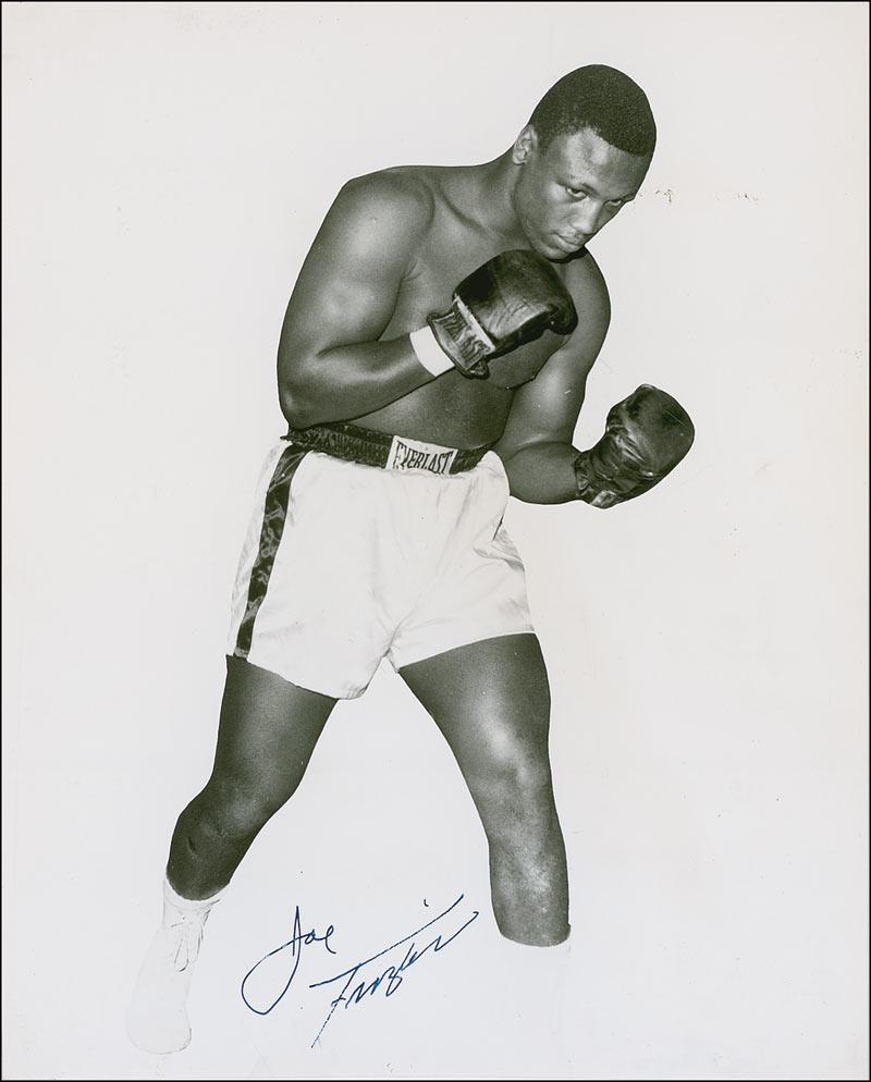 Vintage glossy 8 x 10 photo of a young Frazier in a pugilistic pose, signed in black ink. In fine condition, with a few light bends and surface marks.
