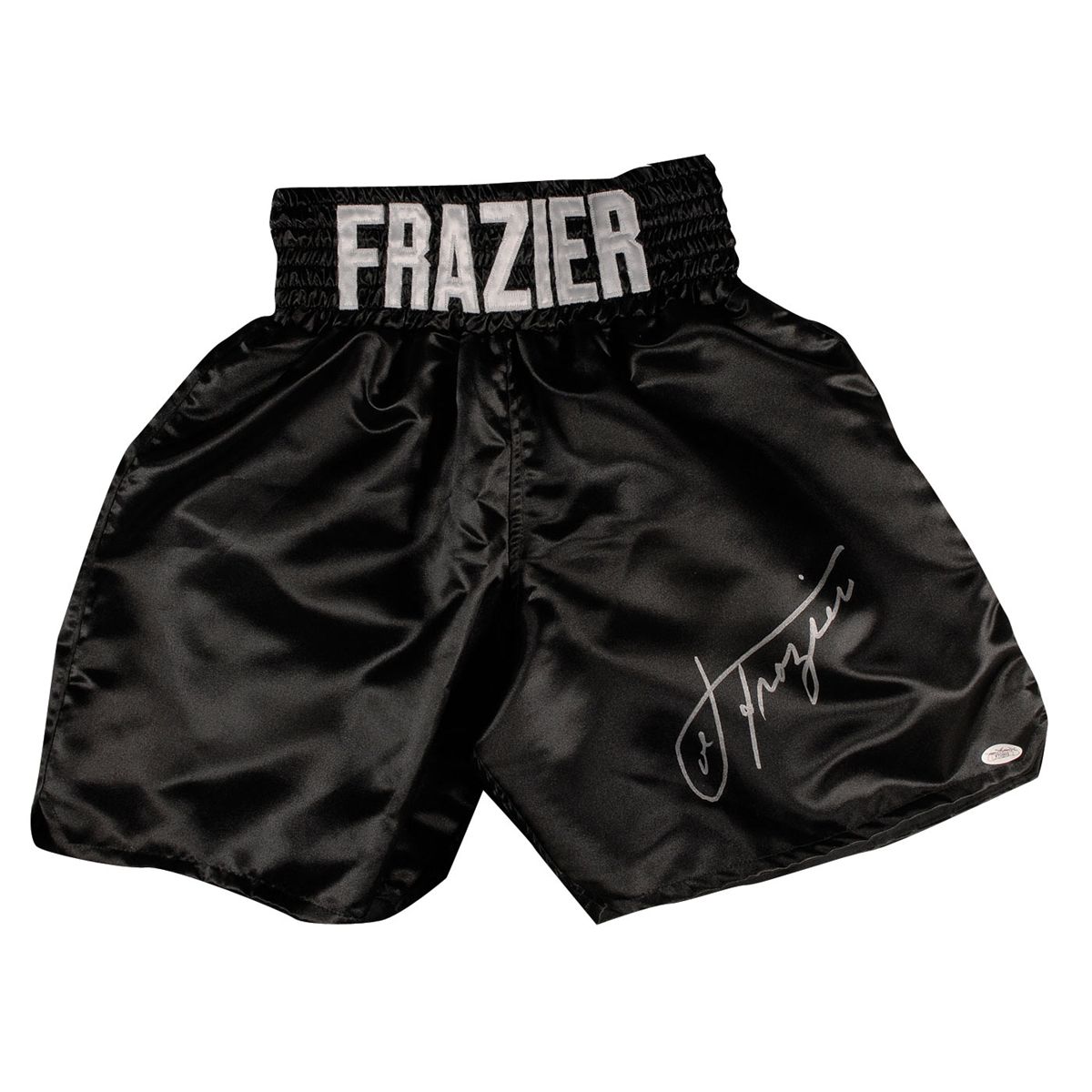 Black boxing trunks signed in silver ink on the front. In fine condition, with a James Spence authentication label affixed to front.