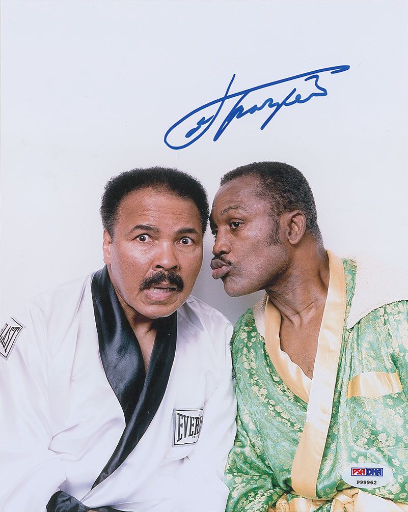 Color glossy 8 x 10 photo of an older Frazier posing side-by-side with an older Muhammad Ali, signed in blue felt tip by Frazier. In fine condition, with a PSA/DNA authentication label affixed to lower corner. Accompanied by a certificate of authenticity from PSA/DNA.