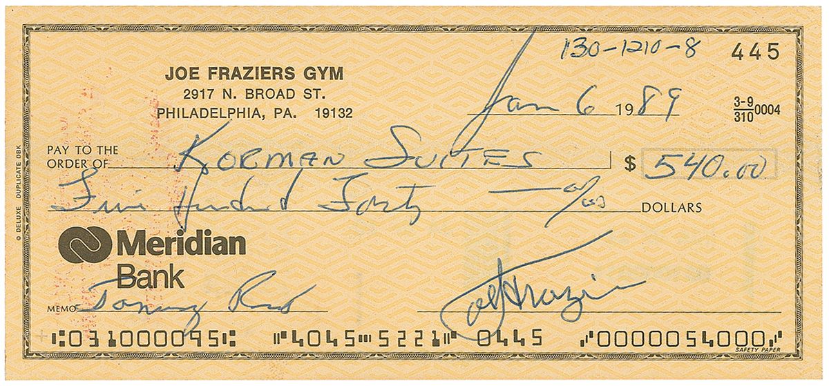 Joe Frazier’s Gym business check, 6 x 2.75, filled out in another hand and signed by Frazier, payable to Korman Suites for $540.00, January 6, 1989. In fine condition, with some light show-through from stamps on reverse. Accompanied by a full letter of authenticity from PSA/DNA.