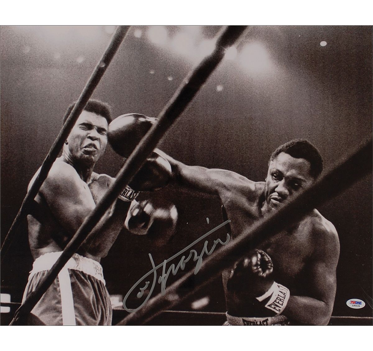 Satin-finish 20 x 16 photo of Frazier pummeling Muhammad Ali, signed in silver ink by Frazier. Rolled and in fine condition, with a PSA/DNA authentication label affixed to lower corner. Accompanied by a certificate of authenticity from PSA/DNA.