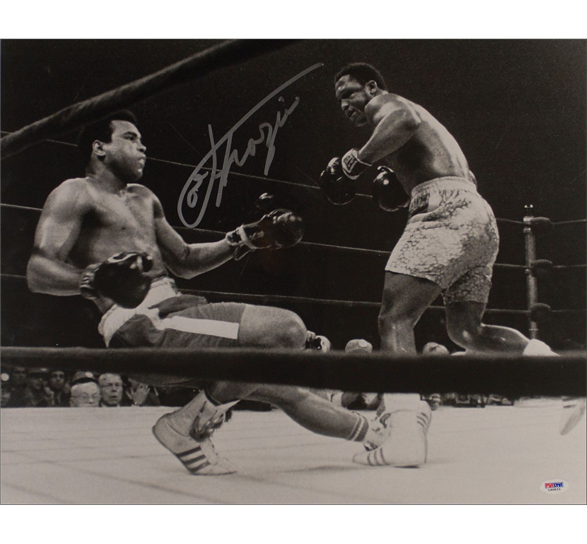 Satin-finish 20 x 16 photo of Frazier dropping Muhammad Ali, signed in silver ink. Rolled and in fine condition, with a PSA/DNA authentication label affixed to lower right. Accompanied by a certificate of authenticity from PSA/DNA.