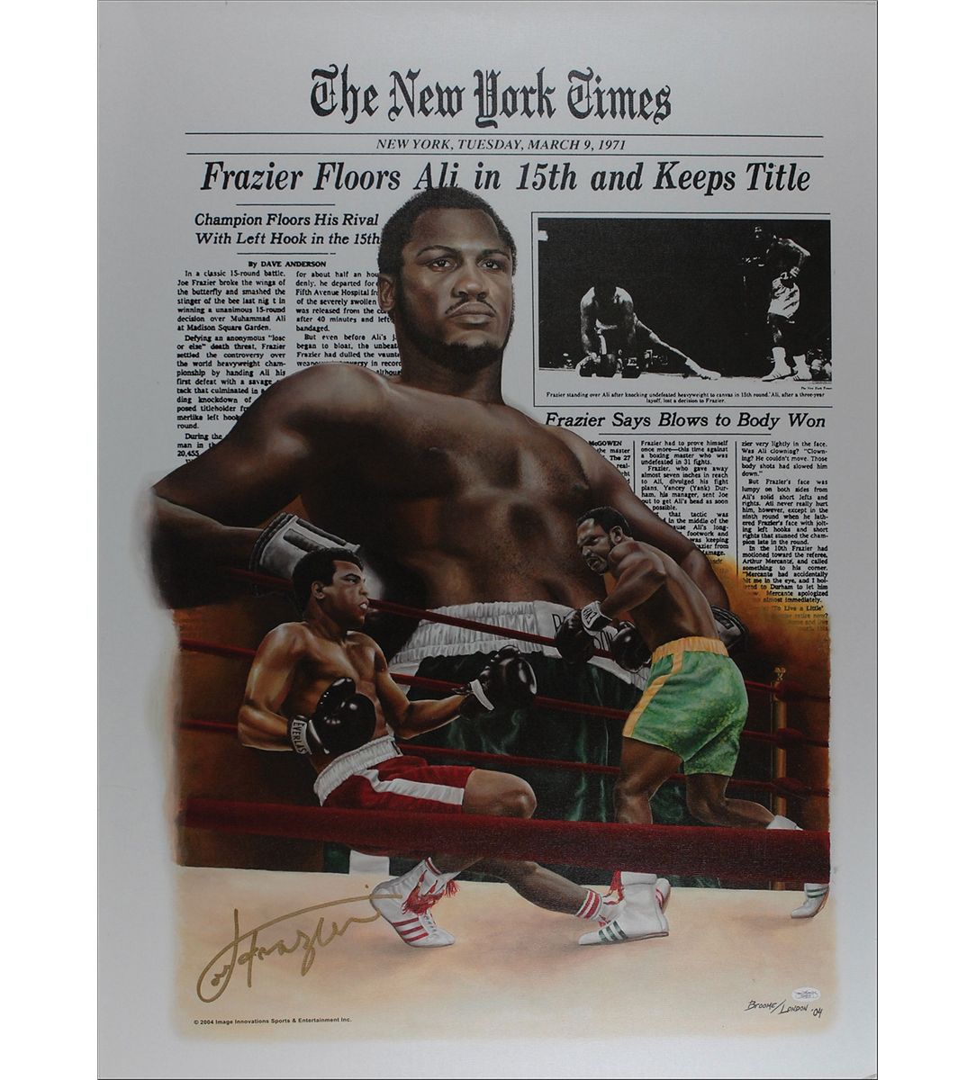 Very nice color giclée print on canvas, 26.5 x 36.5 celebrating Frazier’s victory over Muhammad Ali, signed in gold ink by Frazier. Rolled and in fine condition, with a James Spence authentication label affixed to lower corner.