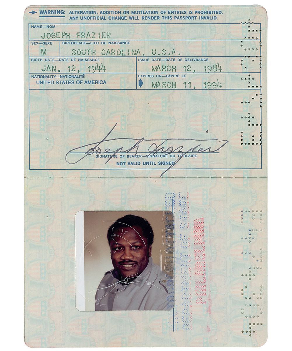 Frazier’s personal passport, number E474304, issued on March 12, 1984. Passport measures 3.5 x 5, and contains his printed personal information on the third page, signed at the bottom “Joseph Frazier.” Affixed on the adjoining page, opposite the personal information page is Frazier’s 2.25 x 2.5 passport snapshot, which bears an embossed State Department seal over top portion. Frazier has also filled his address and emergency contact information on the inside front cover, listing Florence Frazier as his contact. Inside pages bear visa stamps from London, Trinidad and Tobago, and New York. In fine condition, with mild rippling and expected handling wear.
