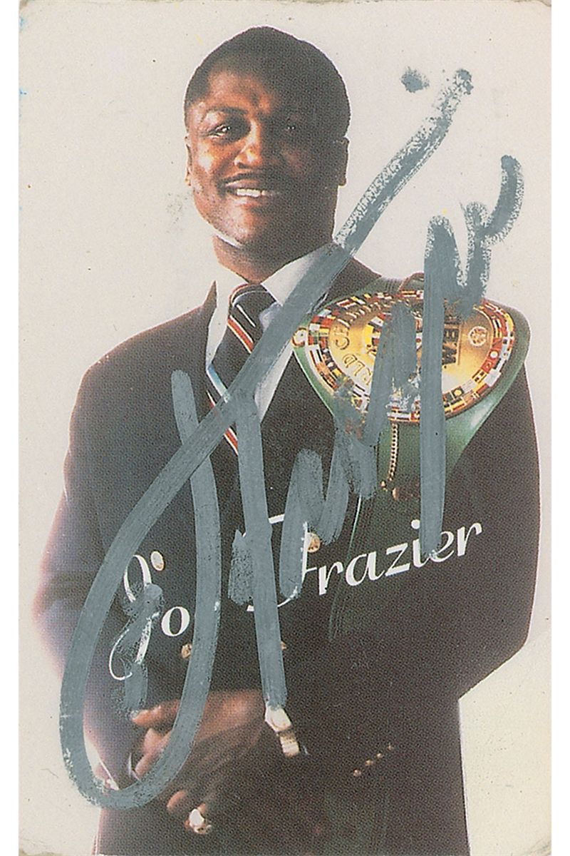 Frazier’s personally-owned leather bi-fold wallet, 4 x 2.5, containing one of his business cards, signed on both sides, as well as his unsigned AARP membership card. Accompanied by a photocopied letter of provenance from his daughter, Weatta Frazier-Collins. In overall fine condition, with expected wear to cards.