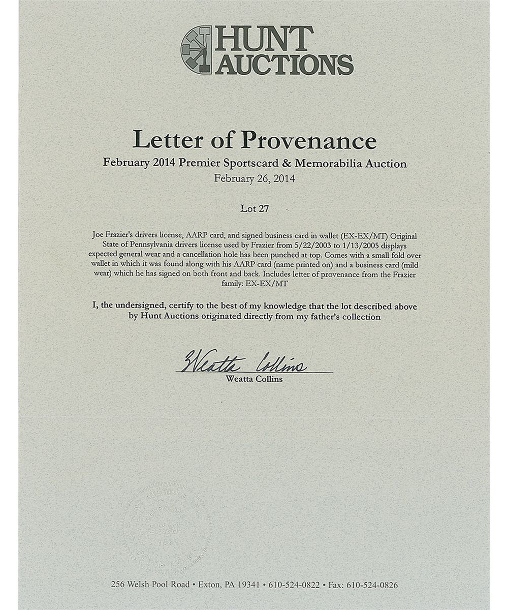 Frazier’s personal Pennsylvania driver’s license, 3,25 x 2, with an expiration date of January 13, 2005, printed with his personal information, photo, and facsimile signature. In fine condition, with expected wear from use, a few bubbles to the laminate finish, and a cancellation hole to the center. Accompanied by a letter of provenance signed by his daughter, Weatta Frazier-Collins. A one-of-a-kind piece from the boxing legend who dealt Muhammad Ali his first defeat in the ‘Fight of the Century’ in 1971.
