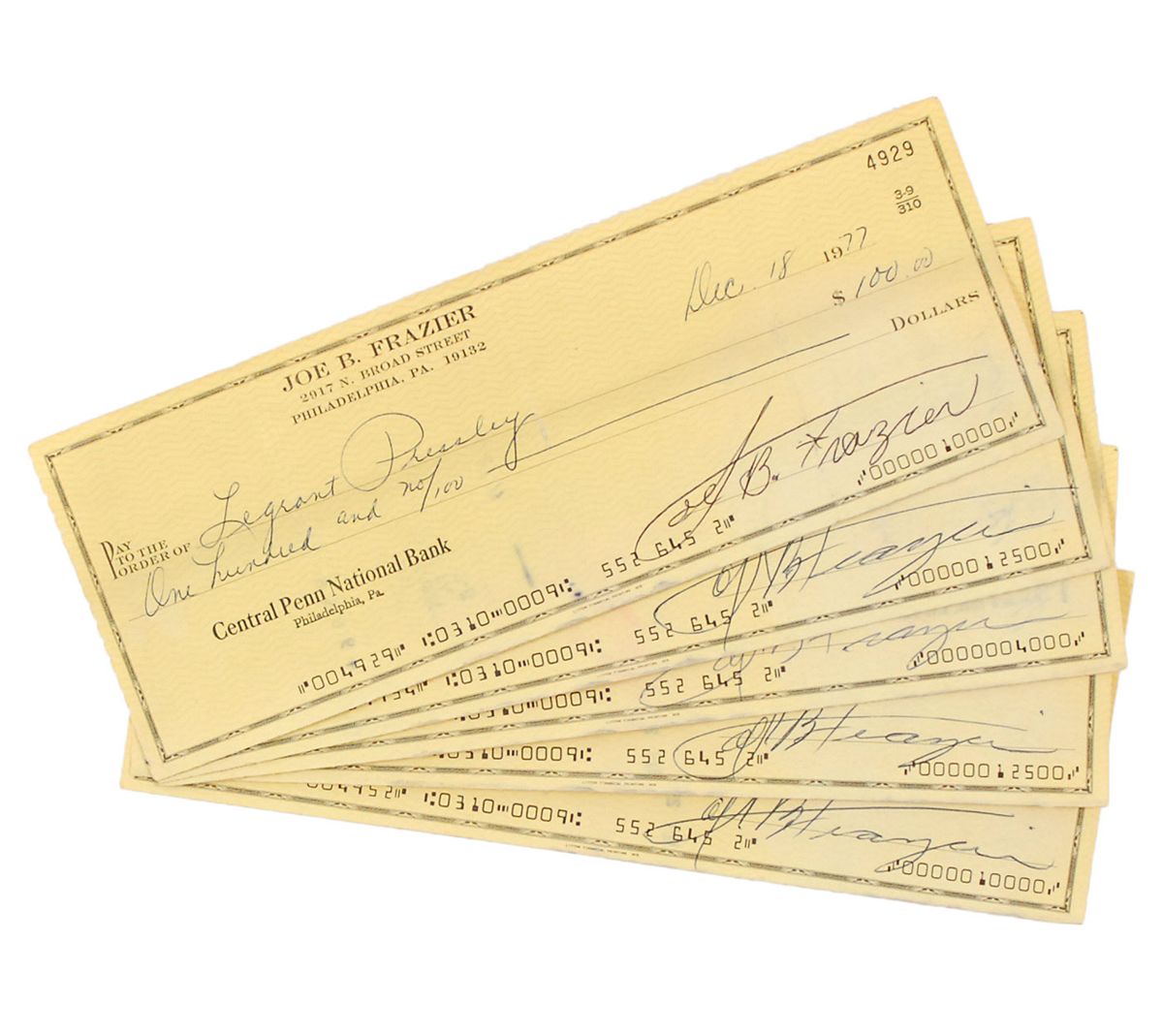 Five personal checks, 8.25 x 3, filled out in another hand and signed by Frazier, “Joe B. Frazier,” dated 1977. In overall fine condition, with various expected bank stamps and check wear. Accompanied by a photocopied letter of provenance from his daughter, Weatta Frazier-Collins.
