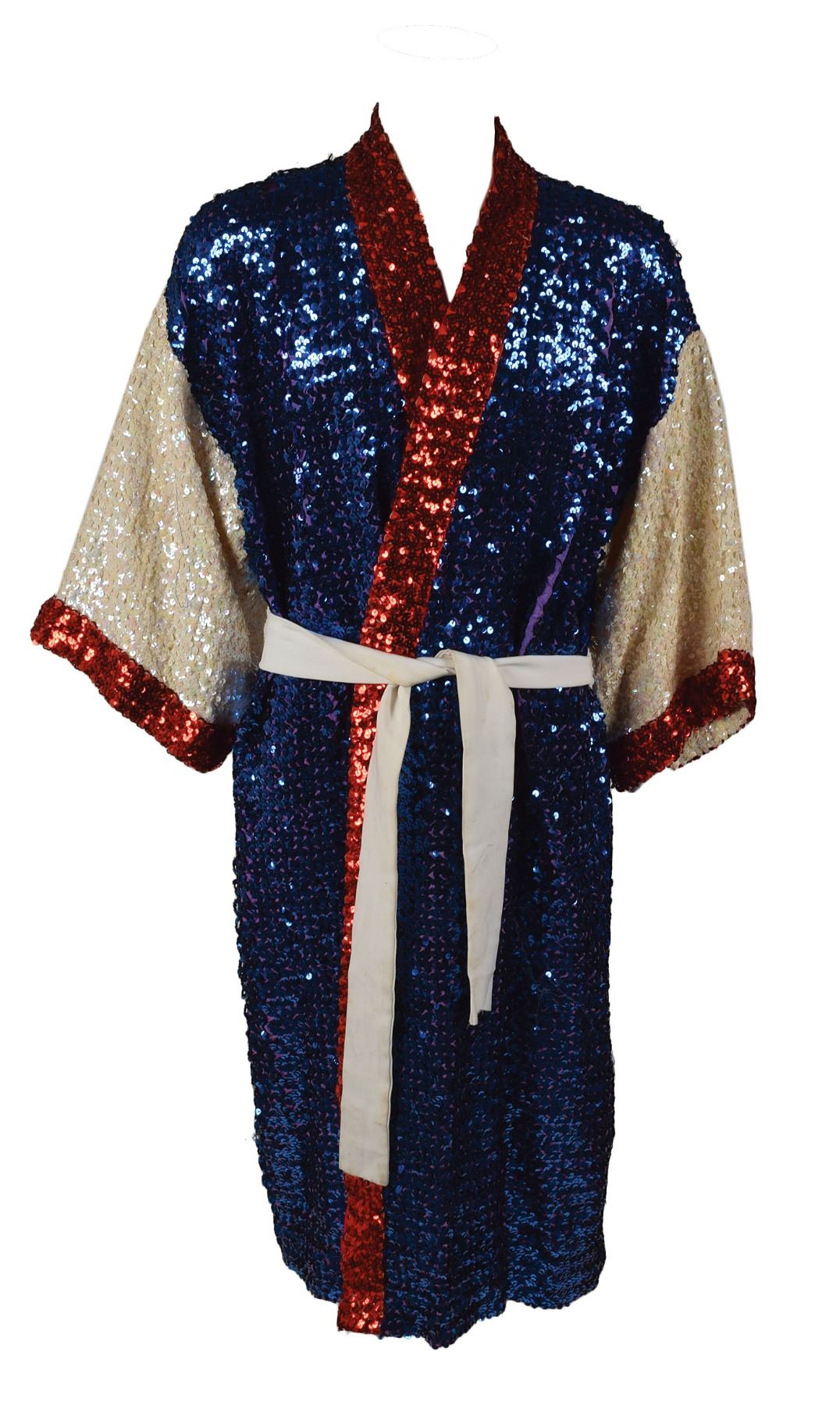 Joe Frazier's dazzling personal red, white, and blue sequined boxing robe lined with purple fabric, circa 1970s, complete with its white sash. In very good to fine condition, with some areas of fraying. Consignor notes that this robe was worn for exhibitions, promos, and weigh-ins, and that it originates from the collection of Les Wolff, who was Joe Frazier’s personal and business manager. This robe was among the personal items left to Wolff upon Frazier's passing. Accompanied by a letter of provenance from Wolff. A flashy fight robe from Smokin' Joe's personal wardrobe.