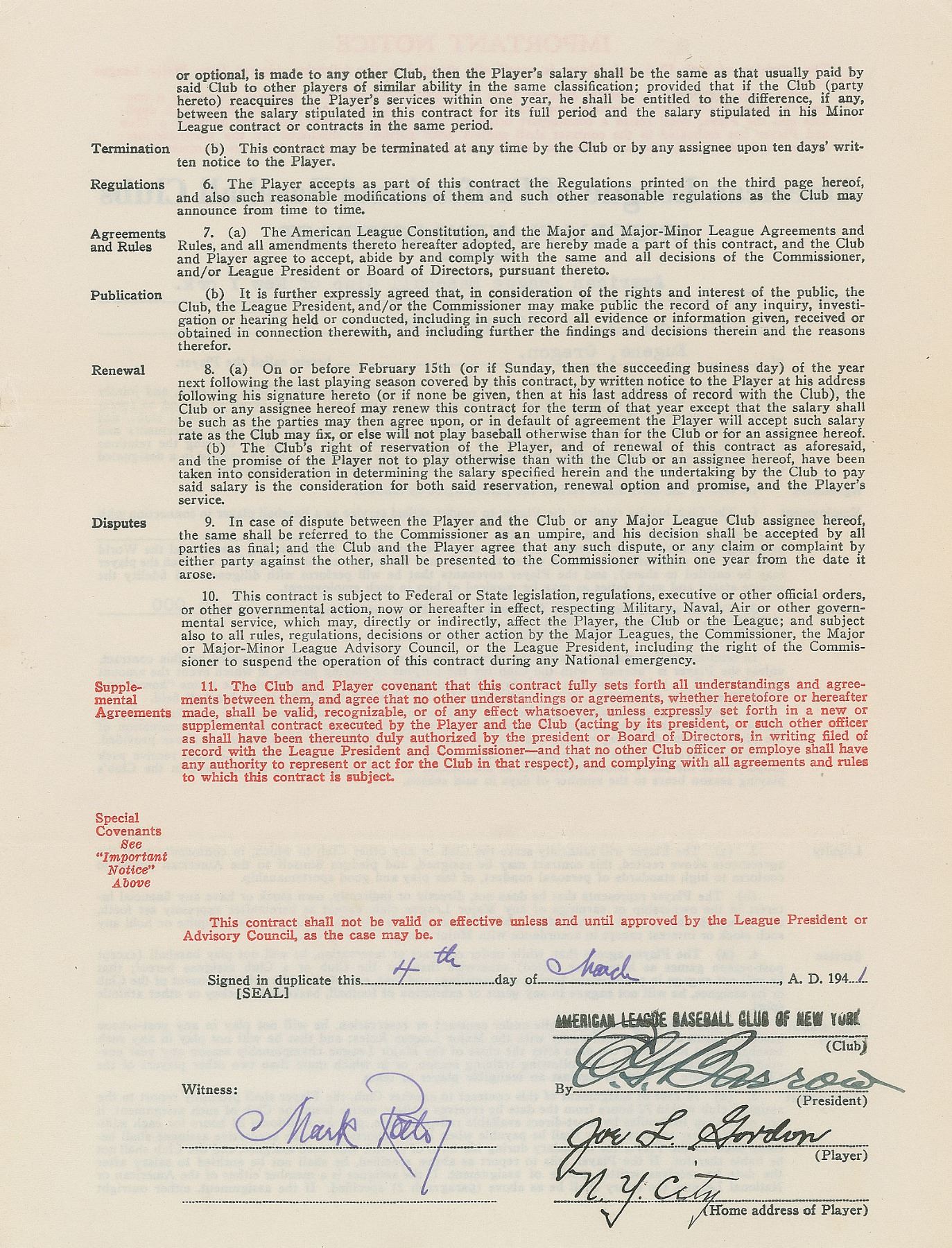 Contract, signed “Joe L. Gordon, N. Y. City,” four pages on two adjoining sheets, 8.5 x 11, March 4, 1941. American League uniform player’s contract in which Joe Gordon agrees to render "skilled services as a baseball player…during the year 1941” for the New York Yankees, for a salary of $15,000. Signed at the conclusion in fountain pen by Gordon and countersigned by Yankees General Manager Ed Barrow. The reverse is signed by American League President William Harridge. In fine condition, with slight edgewear.