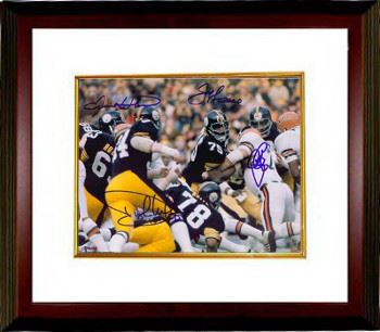 The Steel Curtain was the nickname given to the front four of the famous defensive line of the Pittsburgh Steelers during their 1970s dynasty years. This defense was the backbone of the Steelers dynasty, which won 4 Super Bowls (IX, X, XIII, and XIV). This is a hand autographed Pittsburgh Steelers Steel Curtain 8x10 Photo. 4 Autographs include: Joe Greene, Dwight White (deceased), Ernie Holmes (deceased), and LC Greenwood (deceased). Certificate of Authenticity from Athlon Sports Collectibles. Custom White Mat and Premium Mahogany Color Framed as shown.