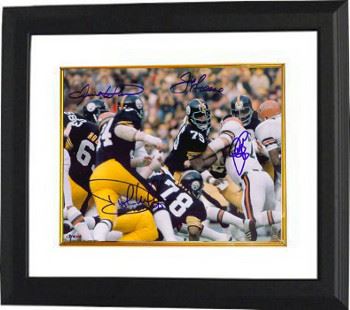 The Steel Curtain was the nickname given to the front four of the famous defensive line of the Pittsburgh Steelers during their 1970s dynasty years. This defense was the backbone of the Steelers dynasty, which won 4 Super Bowls (IX, X, XIII, and XIV). This is a hand autographed Pittsburgh Steelers Steel Curtain 8x10 Photo. 4 Autographs include: Joe Greene, Dwight White (deceased), Ernie Holmes (deceased), and LC Greenwood (deceased). Certificate of Authenticity from Athlon Sports Collectibles. Custom White Mat and Premium Black Color Framed as shown.
