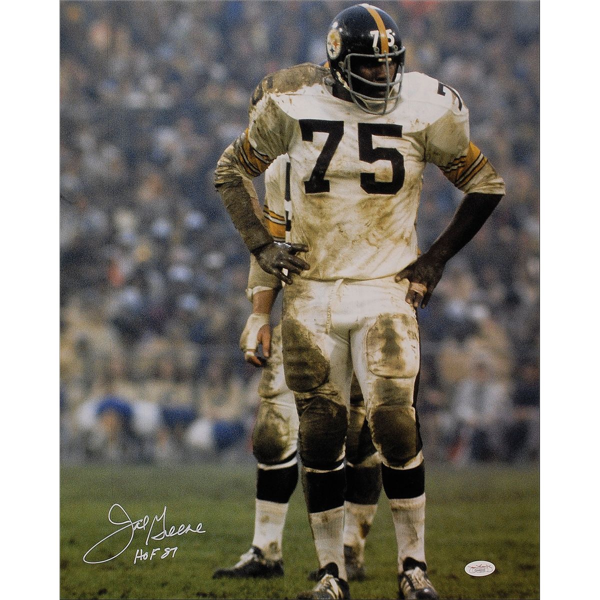 Color glossy 16 x 20 photo of Greene on the field for the Steelers, signed in silver ink, “Joe Greene HOF 87.” In fine condition, with a James Spence authentication label affixed to lower corner.