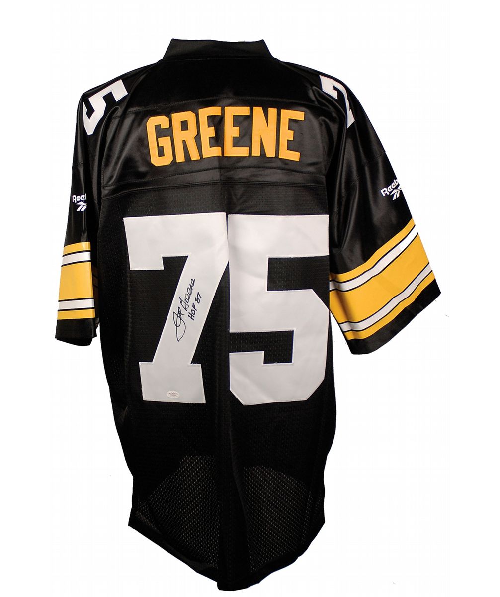 Official Reebok replica Pittsburgh Steelers football jersey, with sewn on letters and numbers, signed in black felt tip on the number on the back, “Joe Greene HOF 87.” In fine condition, with a JSA authentication label affixed to number. Accompanied by a certificate of authenticity from JSA.