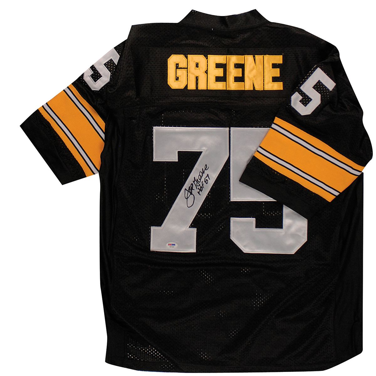 Official Mitchell & Ness replica Pittsburgh Steelers football jersey, with sewn on letters and numbers, signed in black felt tip on the number on the back, “Joe Greene HOF 87.” In fine condition, with a PSA/DNA label affixed to the number.