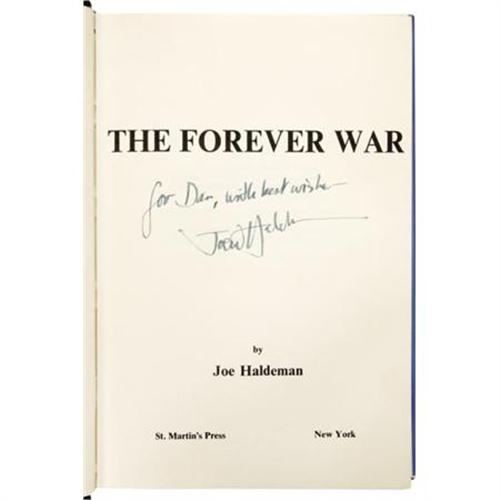 <B>Joe Haldeman: Signed First Edition of <I>The Forever War.</B></I></B></I> (New York: St. Martin's Press, 1974), first edition, 236 pages, black cloth with gilt titles, 8vo (5.75" x 8.5"). Inscribed and signed "<I>For Dan, with best wishes Joe Haldeman</B></I>" on the title page. Winner of the 1975 Nebula, 1976 Hugo, & Locus Award. About fine book in a very good unclipped dust jacket. This is a beautiful crisp copy of this multi-award winning book.<BR><BR><b>Shipping:</b> Books & Catalogs (<a target="_blank" href="http://www.heritageauctions.com/common/shipping.php">view shipping information</a>)