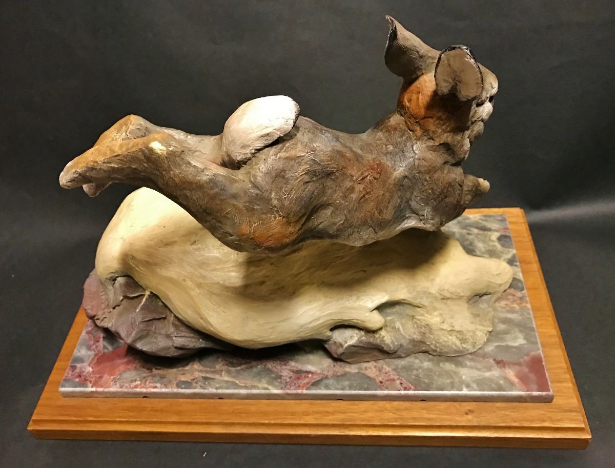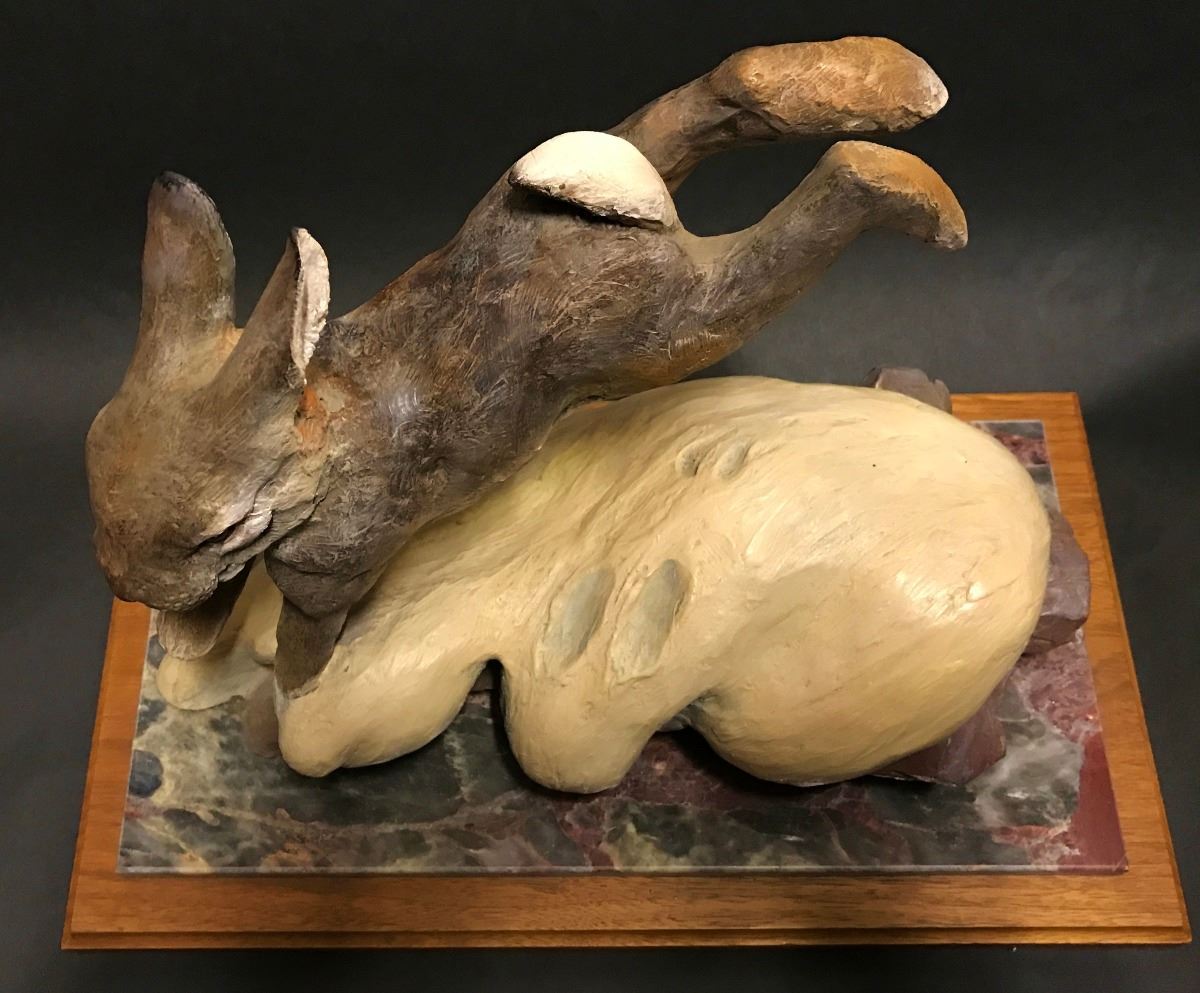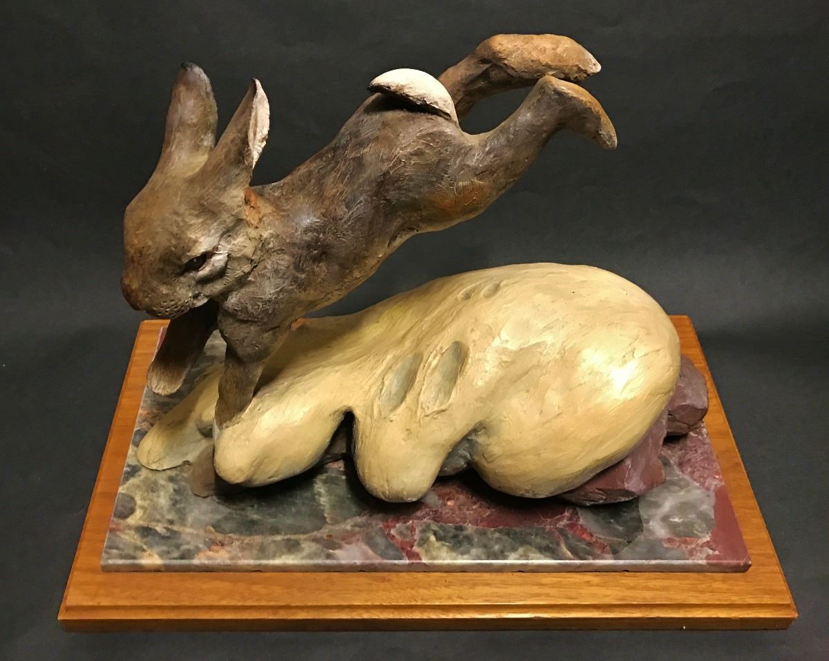 Bunny rabbit jumping a rock, mounted on colorful marble base attached to a walnut plinth, signed and numbered 8 of 12, 13-1/2" x 7-1/2" x 9-1/2" tall, -132001-