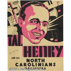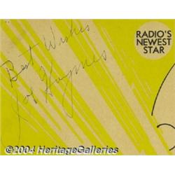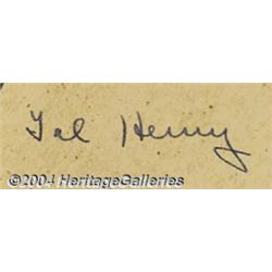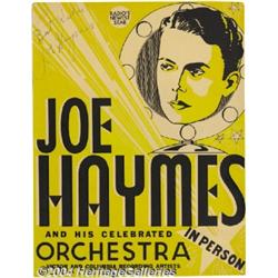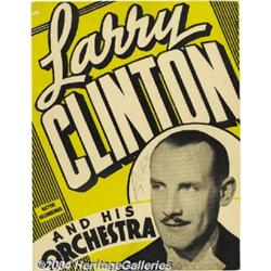 <B>Joe Haymes, Tal Henry, and Larry Clinton Signed Window Cards.</B></I> Joe Haymes had a great ear for talent, but throughout his career, other bandleaders would rob Joe's stable of musicians. It was unfortunate that Joe Haymes never achieved the fame he deserved, but many of the great bandleaders were forever in his debt. This card, in yellow and black has been signed by Haymes at the top right. Small pinholes could be framed or matted out. Tal Henry and his North Carolinians had a brief period of fame in the late 1920s, but within ten years, he had faded into obscurity. This art-deco style card in purple and black features an image of the leader, and Tal has signed at the bottom right. Small pinholes are evident on each corner. Although Larry Clinton played several different instruments, he first gained fame as an arranger for the Casa-Loma Orchestra and the Tommy Dorsey Orchestra. In 1937 Clinton formed his own band. An accomplished pilot, in 1941, Larry Clinton disbanded his group so he could serve as a Lieutenant in the US Air Force. After the war, Larry Clinton never reformed is band, but instead moved to Arizona to become a successful author of Science Fiction novels. This card is signed by Clinton to the right of his image. Attractive with corner pinholes that would matte or frame out. <I>Accompanied by COA from Jazz and Big Band expert Larry Rafferty</B></I>. 3 items <BR><BR><B>Important notice:</B> Heritage usually auctions material at the rate of 200-250 lots per hour. On some occasions eBay Live bid software or the Internet may not be able to keep up with the pace of the auction. We recommend placing a realistic absentee bid now as insurance to avoid disappointment. Occasionally the auctioneer may eliminate or reject an eBay Live bid, and the auctioneer may also reopen a lot after the close of the eBay live bidding (usually because we missed an audience bid), and may reject your bid even if it shows you as the winning bidder. By bidding via eBay Live, you agree that Heritage may award the lot to another bidder at its sole discretion under the circumstances described above or any other reasonable circumstances. Since eBay bids are not shown to us until we open the lot on the floor, we treat those bids just like floor bids. In most cases the floor responds before the eBay bid is presented to us, due to Internet lag time, so for consistency we have made it a policy that floor bids are always considered first over tie eBay live bids. Also please note that all Heritage lots purchased through eBay Live carry a 24.5% Buyer's Premium. Please make sure you read the Terms and Conditions before you bid.