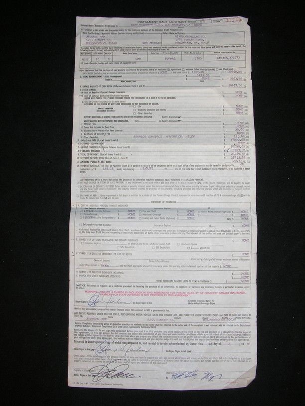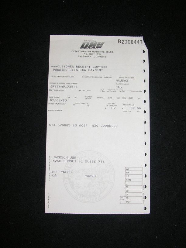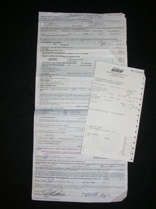 Original car title contract for the purchase of a 1980 Cadillac Limo to be used by his son Michael, hand-signed at the bottom by Joe Jackson and two representatives of the Dixon Cadillac Co. Contract stipulates that Jackson will pay 48 installments of $524.16 commencing 8-8-81. This lot further includes a parking citation receipt issued to Joe Jackson in 1985. Jackson was fined $82