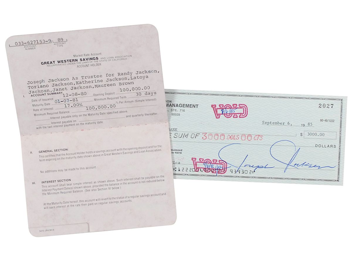 Father and manager of the Jacksons. Joe Jackson Management business check, 8.25 x 3, filled out in type and signed by Jackson, “Joseph Jackson,” payable to City Bank for $3000.00, September 6, 1985. In fine condition, with two bank stamps to body. Accompanied by an unsigned 1980 Great Western Savings bank book for an account Joe was managing for several of the Jacksons, including Randy and Janet, opened with $100,000.00 and earning an impressive 17% interest.