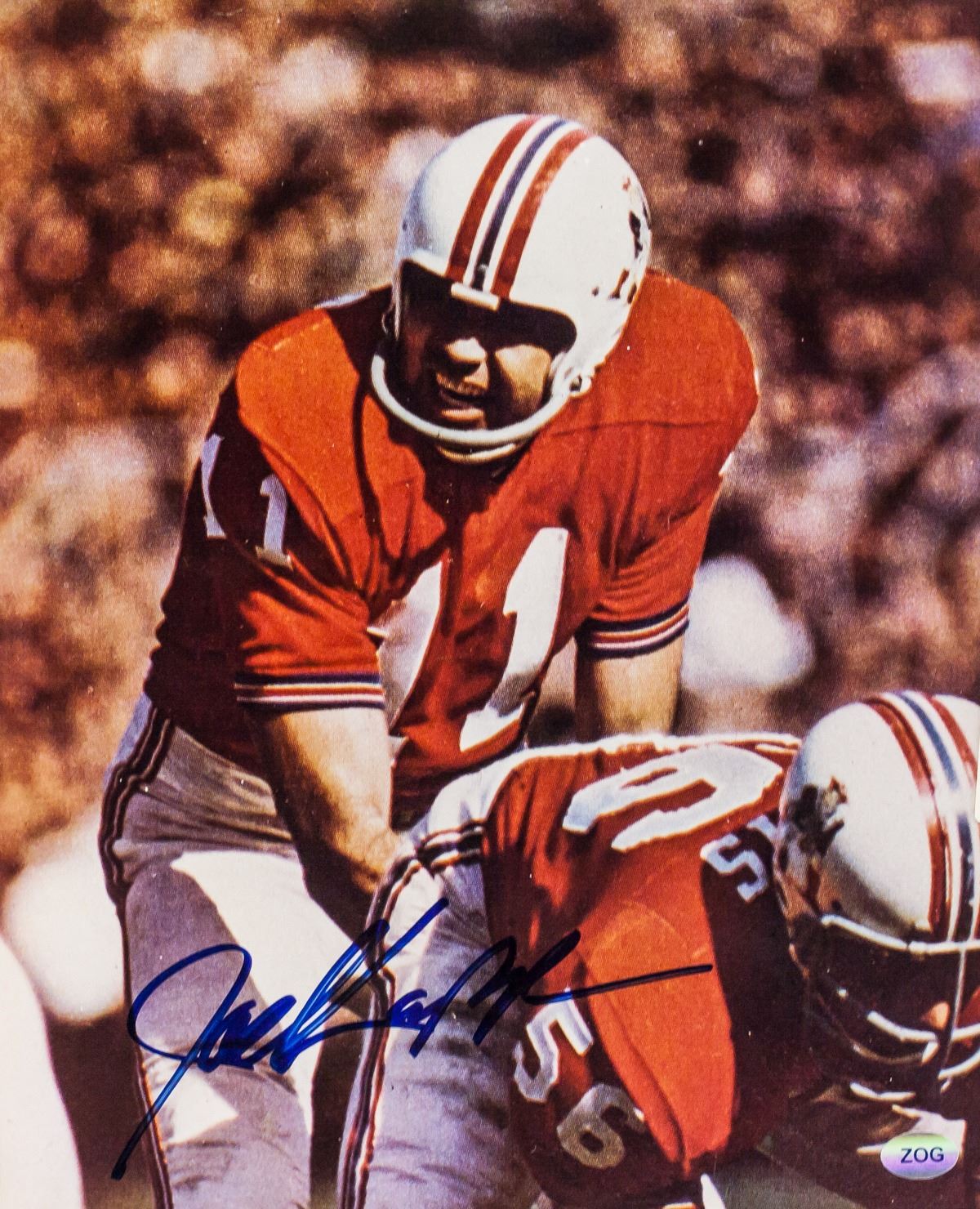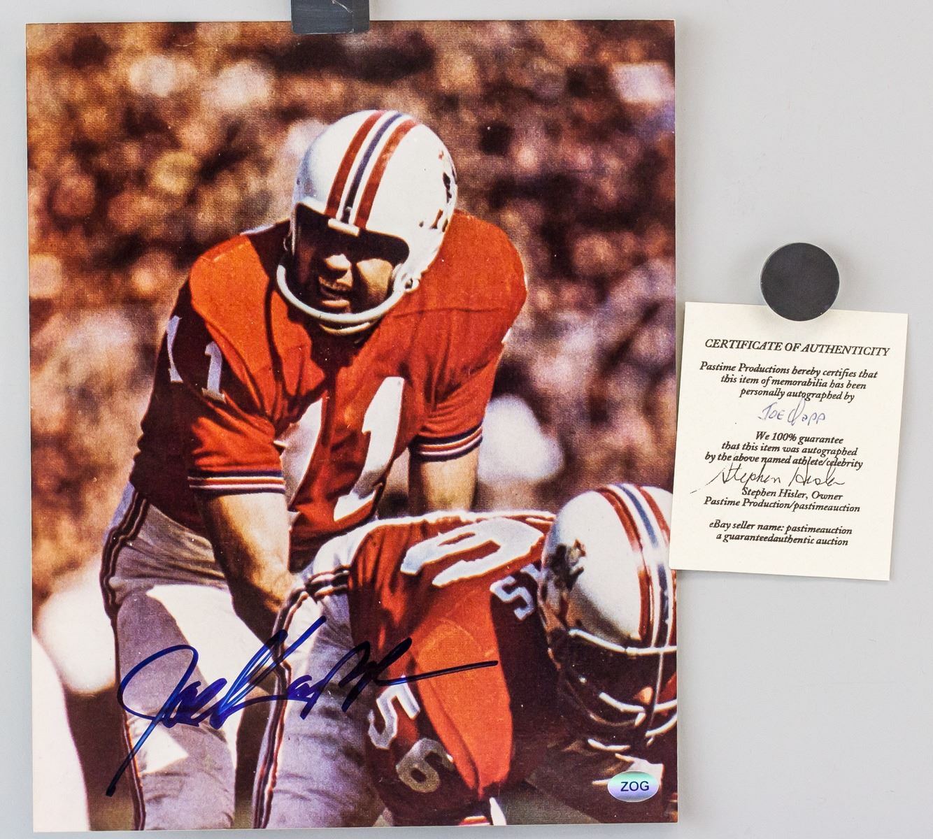 An autographed photograph. Hand signed Joe Kapp (1938- , American). Joseph Robert Kapp is an American former football player, coach, and executive. He played college football as a quarterback at the University of California, Berkeley. Accompanied with certificate of authenticity. 10 x 8 inches