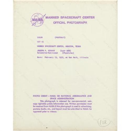 <B>Joe Kerwin Signed Color Photograph,</B></I> 8" x 10", "<I>To Joe Garino/ space program's/ #1 M.D./ Thx for the handball/ lessons/ Joe Kerwin.</B></I>" <I>From the collection of renowned former physical trainer of the astronauts Joe Garino. This lot is accompanied by a signed certificate of authentication from Garino verifying its provenance.</B></I><BR><BR><b>Shipping:</b> Flat Material, Small (<a target="_blank" href="http://www.heritageauctions.com/common/shipping.php">view shipping information</a>)